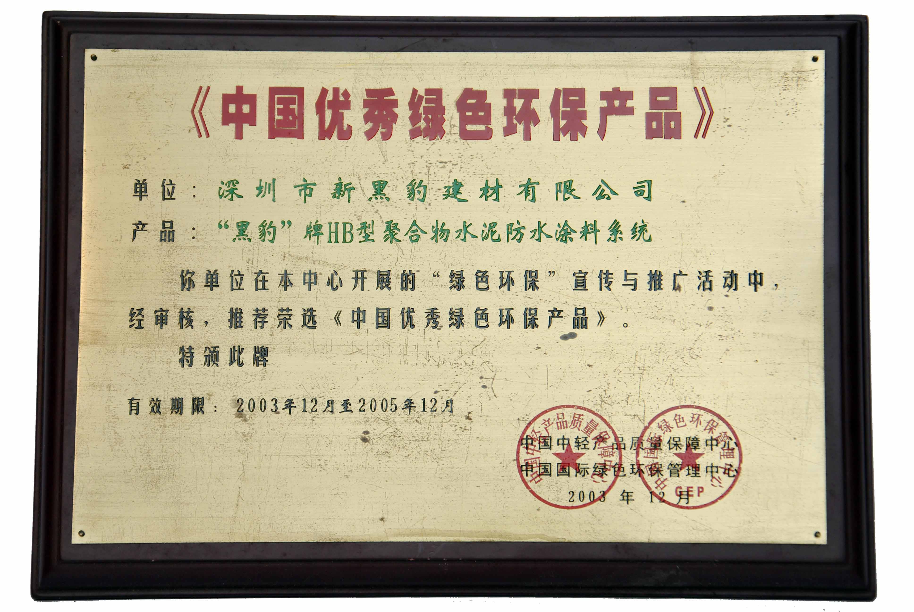 2003年12月,深圳市新黑豹建材有限公司的產(chǎn)品“‘黑豹’牌HB型聚合物水泥防水涂料系統(tǒng)”獲得由中國中輕產(chǎn)品質(zhì)量保障中心和中國國際綠色環(huán)保中心共同頒發(fā)的《中國優(yōu)秀綠色環(huán)保產(chǎn)品》榮譽稱號。