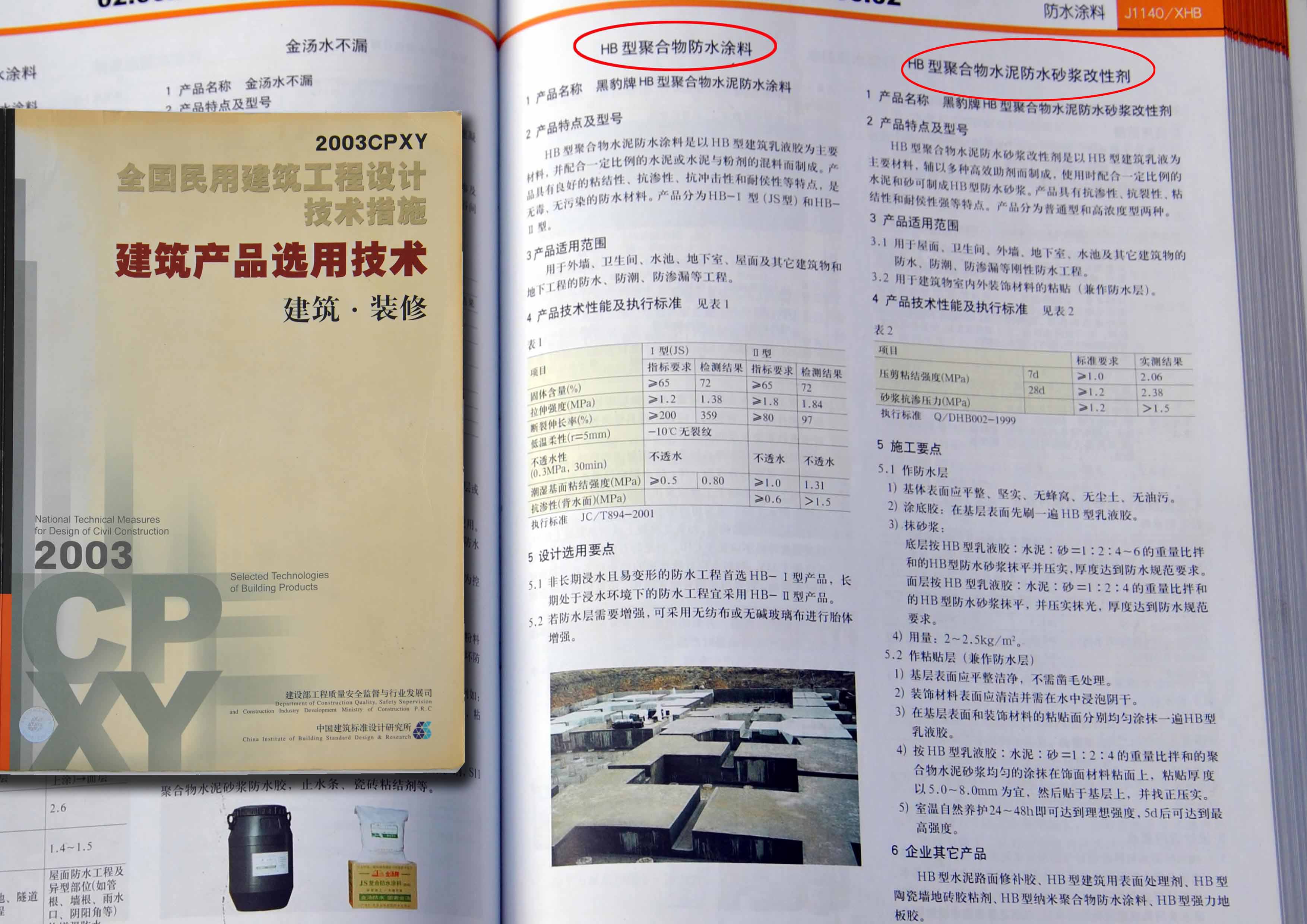 2003年1月出版的《2003CPXY全國(guó)民用建筑工程設(shè)計(jì)技術(shù)措施 建筑產(chǎn)品選用技術(shù)(結(jié)構(gòu) 建筑 裝修)》闡述了各類產(chǎn)品的適用范圍,技術(shù)性能,選用要點(diǎn)以及技術(shù)經(jīng)濟(jì)分析等,用于指導(dǎo)如何正確選用建筑產(chǎn)品。該部分由國(guó)內(nèi)130余位專家編制,110余位專家審定。對(duì)64大類290余小類產(chǎn)品從技術(shù)及經(jīng)濟(jì)角度總體論述其選用要點(diǎn),目的是解決怎么選產(chǎn)品的問(wèn)題。我深圳市新黑豹建材有限公司的產(chǎn)品“HB型聚合物水泥防水涂料”和“聚合物水泥防水砂漿改性劑”收編在內(nèi)。 |
