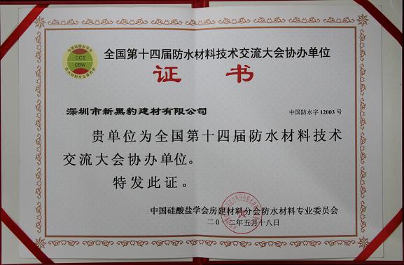第十四屆全國防水材料技術(shù)交流大會(以下簡稱為“大會”)由中國硅酸鹽學(xué)會房建材料分會防水材料專業(yè)委員會主辦。本大會于2012年5月18—20日在重慶市貴僑酒店隆重召開,出席了此交流大會的近400名代表分別來自全國各地有關(guān)建筑防水堵漏生產(chǎn)、科研、檢測、施工、管理、社團(tuán)組織等300多個(gè)單位。本次大會由中國中材集團(tuán)蘇州非礦院防水材料設(shè)計(jì)研究所等6家公司共同承辦,由深圳市新黑豹建材有限公司等22家單位協(xié)辦,并得到了其他19家單位的支持。本公司在大會期間,獲得了中國硅酸鹽學(xué)會房建材料分會防水材料專委會的頒發(fā)的“全國第十四屆防水材料技術(shù)交流大會協(xié)辦單位”的證書。