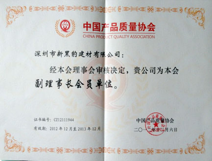 2012年12月,深圳市新黑豹建材有限公司成為中國產(chǎn)品質(zhì)量協(xié)會的副理事長單位,我司將積極努力并充分發(fā)揮協(xié)會組織、協(xié)調(diào)、服務(wù)職能,為提高我國產(chǎn)品與服務(wù)質(zhì)量的總體水平做出最大貢獻(xiàn)。