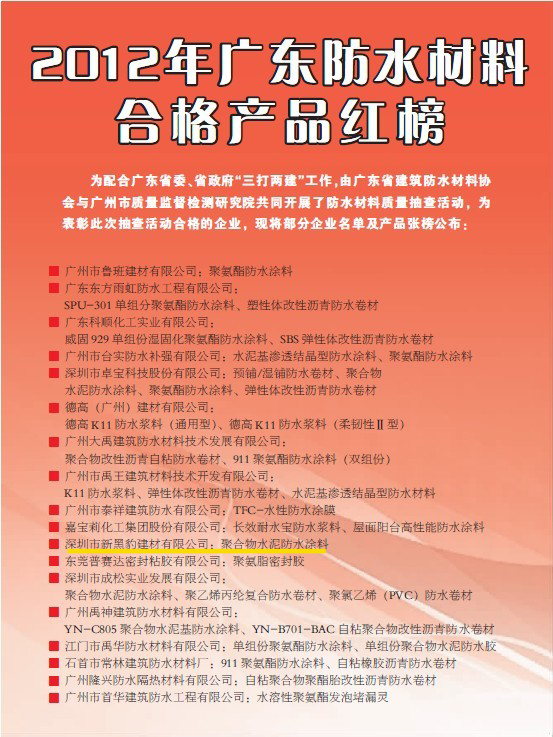 熱烈慶祝我公司登上了《2012年廣東防水材料合格產(chǎn)品紅榜》