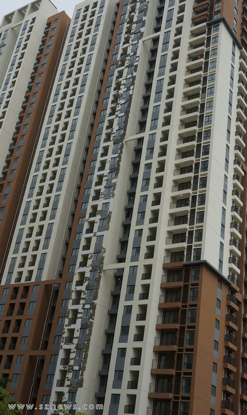 近日,有不少網(wǎng)友在深圳各大論壇反映,深圳安居房中海閱景花園項目外墻嚴重脫落,7月25日記者在現(xiàn)場發(fā)現(xiàn),閱景花園4棟塔樓均存在不同程度的外墻脫落,最嚴重的部分從一樓到頂樓均有脫落現(xiàn)象。