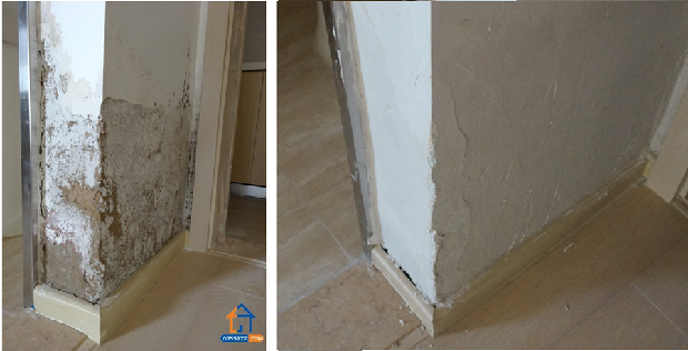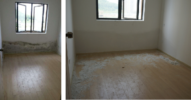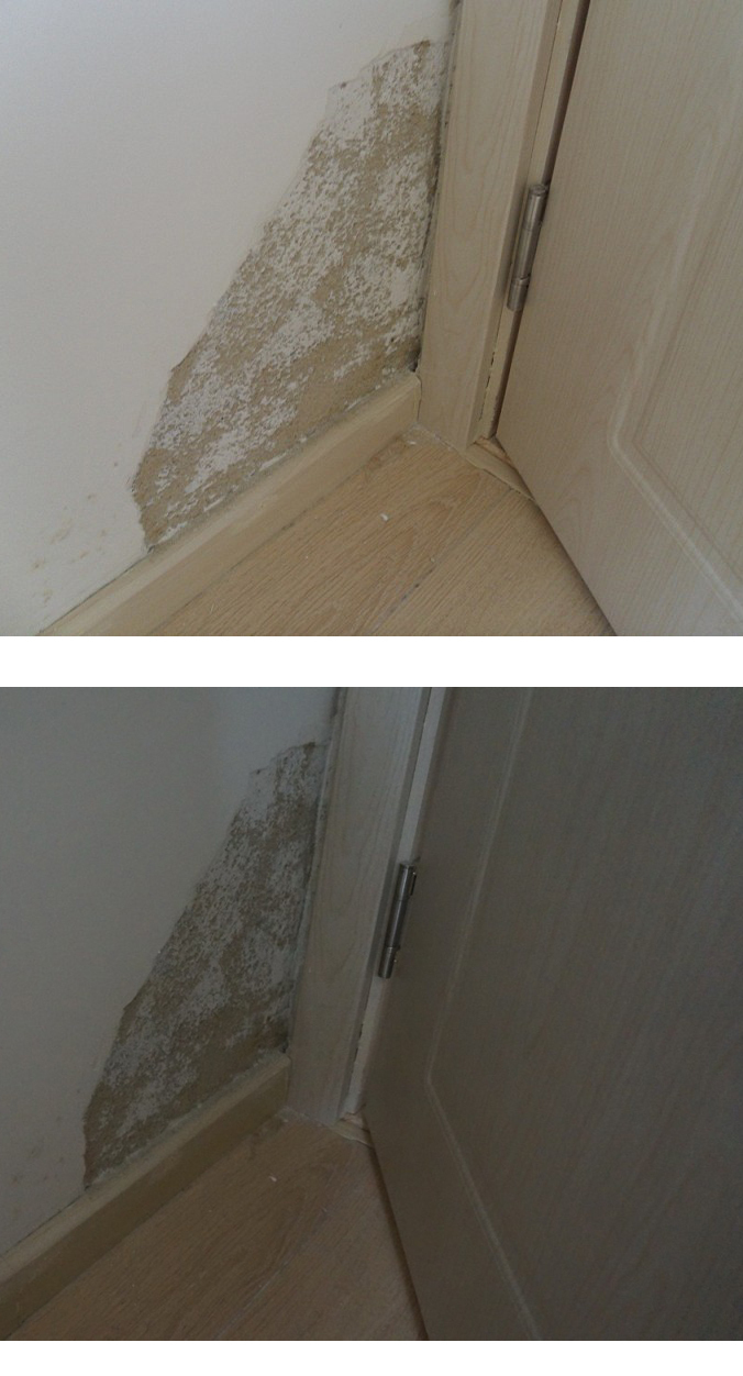 記者在現(xiàn)場看到, 410號房和718號房同樣位置,墻壁重新修補粉刷的痕跡明顯,2912房間墻角處的剝落仍未修補,2916房未見明顯的滲水痕跡。中海相關負責人解釋,410號房的墻壁問題,是由于該墻壁外接露臺,前期施工中露臺與墻壁間存在縫隙導致滲水,718房間的滲水,是因為供水管道接口存在問題;而2912墻角處的剝落,目前尚未查清究竟是供水管道滲水,還是建筑工人用水不當導致墻壁被浸泡。
