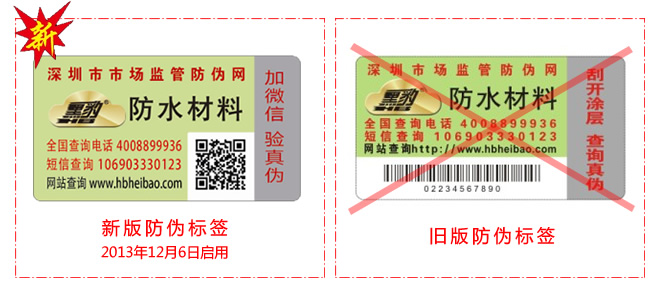 為了更好的幫助客戶辨別我公司生產(chǎn)的聚合物水泥防水涂料及其它防水材料,我公司即日起將啟用新版的防偽查詢標(biāo)簽。新版防偽標(biāo)簽在保持原用功能不變的基礎(chǔ)上增加了二維碼防偽查詢功能。在每個(gè)防偽標(biāo)簽上都印有二維碼,您可以使用微信的“掃一掃”功能描掃二維碼添加我公司的微信公眾平臺(hbheibao),并將此二維碼拍照傳送至我公司的微信公眾平臺(hbheibao),我公司將有專人為您辨別真?zhèn)?。我公司原有的防偽查詢電?008899936,短信查詢號碼:106903330123和網(wǎng)站查詢網(wǎng)址m.gdjyxl.com的查詢方法及方式都保持不變。