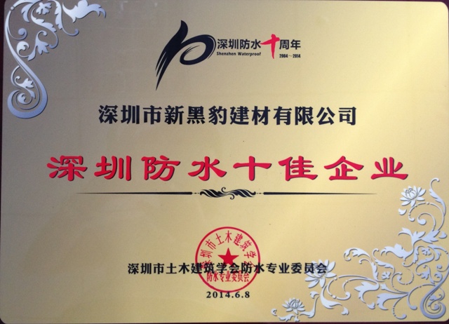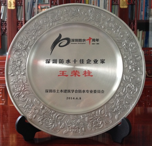 在深圳市防水專業(yè)委員會(huì)成立十周年紀(jì)念大會(huì)上,我公司獲得“深圳防水十佳企業(yè)”、“防水自律標(biāo)桿企業(yè)”榮譽(yù)稱號(hào),董事長(zhǎng)王榮柱榮獲“深圳防水十佳企業(yè)家”稱號(hào)。