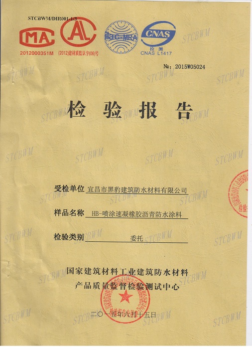 我公司研發(fā)的HB噴涂速凝橡膠瀝青防水涂料,現(xiàn)已委托我公司的控股子公司宜昌市黑豹建筑防水材料有限公司生產(chǎn)并委托國家建筑防水材料產(chǎn)品質(zhì)量監(jiān)督檢驗(yàn)測(cè)試中心按照我公司企業(yè)標(biāo)準(zhǔn)進(jìn)行了型式檢驗(yàn)?,F(xiàn)檢測(cè)結(jié)果均符合我公司的企業(yè)標(biāo)準(zhǔn)。