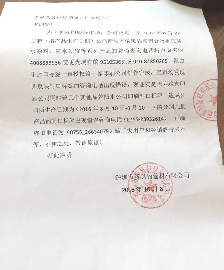 您們好,最近,有一些不法分子,假借我公司名譽(yù)私刻我公司公章,在社會上散發(fā)更改防偽查詢電話說明的文件(如下圖),說:“反映封口標(biāo)簽的咨詢電話出現(xiàn)錯誤”、“是印刷公司同時給幾個其他品牌防水公司印刷封口標(biāo)簽”所致,這簡直是一派胡言,我新黑豹建材有限公司,從來就沒有出現(xiàn)過這件事,沒有更換過封口條。我們只更換過防偽驗證碼,在更換時,工作非常仔細(xì)、非常嚴(yán)謹(jǐn),都是提前一個多月告訴消費者。因此請廣大客戶千萬別上當(dāng),同時,我們也會保留對不法分子追究法律責(zé)任的權(quán)利。
