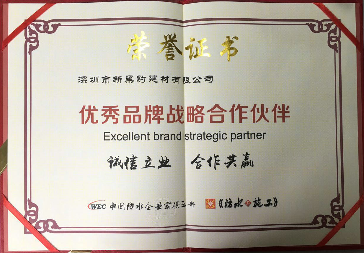 2016年10月,我公司被《防水與施工》雜志評為優秀品牌戰略合作伙伴,我公司一定不會辜負消費者的期望,將在未來的事業發展中,為消費者提供更好的防水產品,為中國防水材料事業的發展做出新的貢獻!