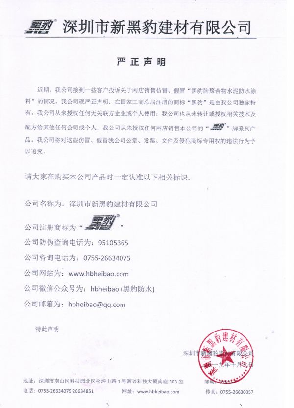 公司防偽查詢電話為:95105365 公司咨詢電話為:0755-26634075 公司網(wǎng)站為:m.gdjyxl.com 公司微信公眾號(hào)為:hbheibao (黑豹防水) 公司郵箱為:hbheibao@qq.com 特此聲明 深圳市新黑豹建材有限公司 二0一九年十月八日